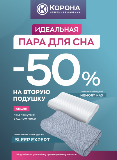 С 1 декабря 2025 года по 28 февраля 2026 года при покупке двух подушек в одном чеке вы получаете скидку 50% на вторую подушку.